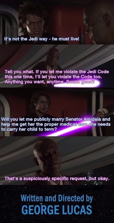 Now, there is a lot of speculation about how this could have gone differently. Perhaps Master Windu could have offered Anakin a quid pro quo deal to allow him to kill Sidious without trial. Perhaps Anakin’s Master, Obi-wan Kenobi, could have told the truth about knowing about Anakin’s relationship and made him come clean, keeping Anakin out of any sort of position where he could interfere with Sidious’s arrest. Perhaps Padmé could have convinced Anakin to leave the Jedi Order or turn against Sidious. But none of these happened. Why? Because Anakin valued both his allegiance to the Jedi Order and his wife too much to let go of either. Padmé was neither conniving nor power-hungry enough to try to convince Anakin to usurp Sidious. Nor did Anakin trust anyone in the Order, even his own Master, to tell him about Sidious’s offer to him, for in doing so he would have exposed his secret marriage, putting his status as a Jedi in jeopardy.