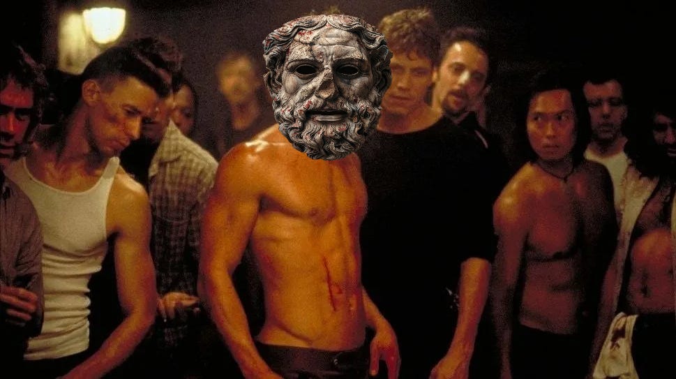 You’ve all seen the holovid. A bunch of disaffected men, who feel like they no longer have a place in society, meet in the basement of a diner each Monday night, and they fight with one another. Before the fight, the leader, Tyler Durden, explains the rules of the club. The first two of those rules are also shared by our society.